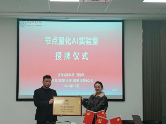 分享会结束后,节点量化负责人梅宇与湖南城市学院理学院领导共同为校企共建“节点量化AI实验室”授牌并合影留念,标志着双方合作迈出实质性步伐。